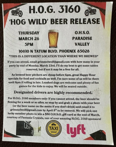 For H.O.G. 3160 members only: If you cannot attend, the beer should be